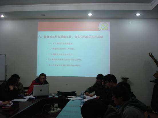 首先,进行了对中国共产党第十七届中央委员会第四次全体会议精神的学习,通过PPT重点学习了中国共产党第十七届中央委员会第四次全体会议通过的“中共中央关于加强和改进新形势下党的建设若干重大问题的决定”。其中,我们着重讨论了“做好抓基层打基础工作,夯实党执政的组织基础”、“弘扬党的优良作风,保持党同人民群众的血肉联系”这两个与我们学生基层党支部直接相关的部分,使同学们受益良多。