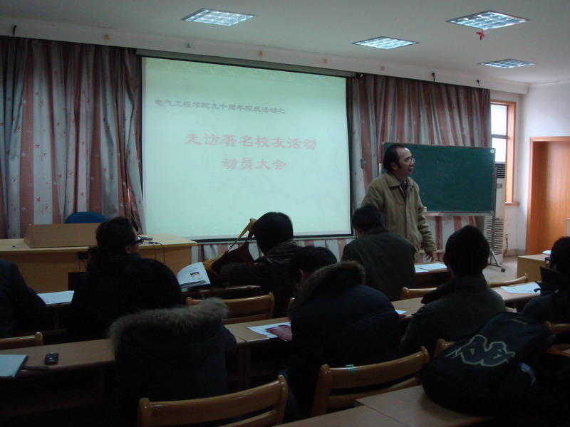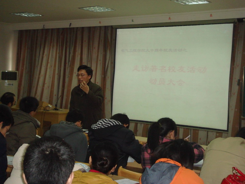 学院党委书记王瑞飞对本次活动给予了充分的肯定和热情的支持。他向同学们阐释了学院九十年院庆的背景资料和历史意义,并着重强调指出,院庆的目的绝不仅仅是简简单单的庆祝活动,而是通过院庆,将浙大最具传统的优良学科发扬光大。对于走访校友活动,王书记给予了四点指导意见。他指出,首先希望广大同学能够通过走访校友活动,挖掘历代电气人代代相传的“电气精神”,提炼电气的优良文化传统;其次,走访校友活动本身就是一次难得的学习机会,广大同学要把握住这一珍贵的与优秀校友面对面的机会,学习他们的社会生活经验;再次,本次校友走访活动也是一个凝聚学院资源,积累社会资源的好机会,希望通过广大同学的走访交流,能够为学院提供更多更宝贵的社会资源;最后,希望广大同学能够带去学院对他们的诚挚的问候与真诚的祝福,并对他们在过去的岁月中为学院的发展作出的贡献表示衷心的感谢,并希望在走访中,能够向各位校友取经,希望他们为学院进一步发展提供宝贵的意见和建议。