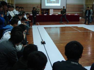 接着,beat365平台唯一官网“华硕杯” 第三届大学生智能汽车竞赛预赛正式开始。三个小组的选手先后拿出自己的智能车上白底黑线的跑道。调试,开启,跑动,转弯,底下的观众发出一阵阵欢呼。当看到某几组的选手因为智能车出现故障停在跑道中而去紧张临时维修时,底下的观众又是喊出鼓励的加油声。最终,各个小组的名次根据智能车的速度排定,也评出进入决赛的名单。