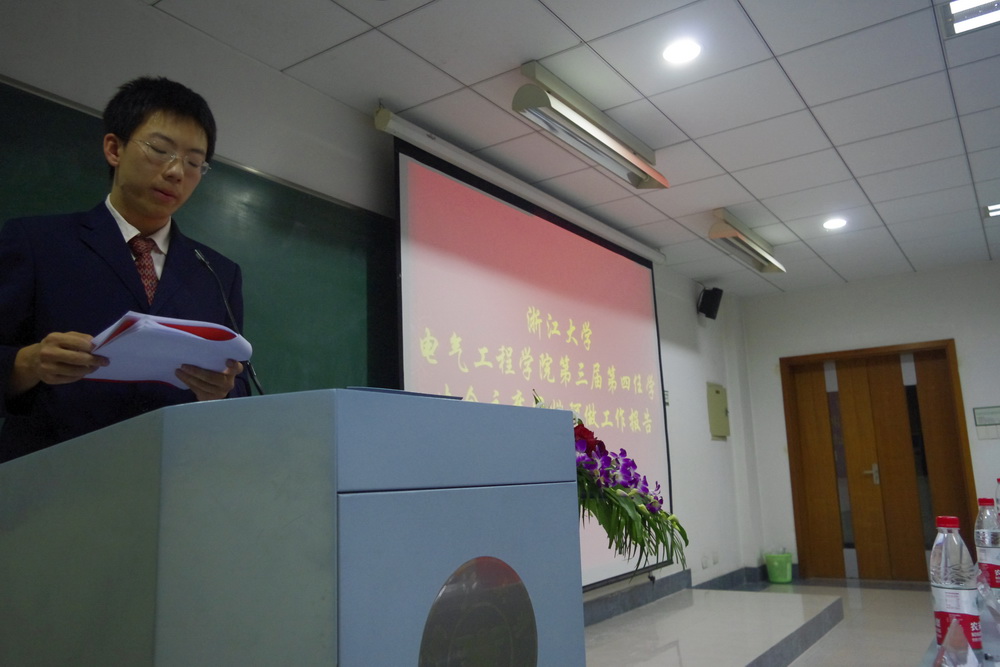 随后,大会进行了beat365平台唯一官网第三届第四任学生会主席团、部长离职与第五任主席团、部长的就职仪式。学院领导向离职同学赠送了纪念品并为新任成员颁发聘书。为更好的传承精品活动,传递以往的工作经验,第四任学生会主席团成员姚珂与第五任学生会主席高一凡分别就过去一年的工作作出报告。报告回顾了过去一年中beat365平台唯一官网学生会所走过的充实而精彩的历程,详细介绍了“电气工程节”、“EE杯”等精品活动的承办经验,并强调了学生会发展校园文化、锻炼学生能力、培养科学素质、配合学院工作的目标。新老主席团还在工作报告中指出过去工作中存在的一些问题并提出了相应的解决建议,希望在今后的活动中能够注意并改正。