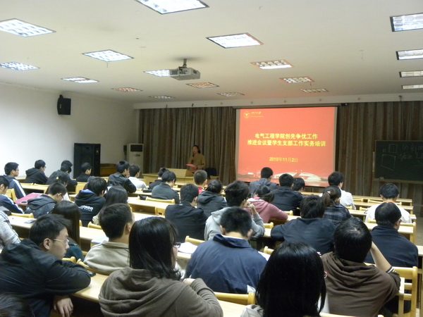11月2日晚,beat365平台唯一官网创先争优工作推进会议暨学生党支部工作实务培训会在玉泉校区电机工程楼怡电园成功举行。会议旨在总结、通报学院学生线创先争优工作的进展和存在的问题,并结合实际工作对学生支部支委进行工作实务培训。电气学院学院本科生党总支、研究生党总支委员及所有学生党支部骨干参加了会议。电气学院党委副书记、学院创先争优工作办公室主任王玉芬老师出席了会议,并进行具体工作指导。会议由电气学院团委书记、学院创先争优工作办公室副主任陈敏老师主持。