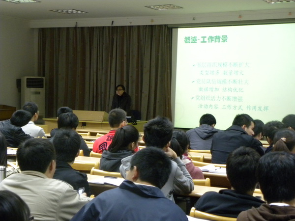 会议第二阶段,陈敏老师结合新形势下学生党支部工作的背景,对与会学生党建骨干进行了党支部工作的实务培训。结合具体数据,陈老师指出,在基层组织规模不断扩大、党员队伍规模不断扩大、基层党组织活力不断增强的背景下,基层党支部必须做到科学设置、有效覆盖、拓展功能、激发活力。在随后的讲解中,陈老师一一指出学生党建工作中可能出现的问题,并具体介绍了党员发展过程中需要注意的工作制度和规章,以及基层党支部管理规范。陈老师特别强调了对于党员的发展要坚持“入党自愿,个别吸收”的原则,基层党支部要加强党员教育和党员管理,在发展党员的过程中严格把关,做到成熟一个发展一个。培训内容具体、全面,为学生党建骨干提供了一个难得的学习机会。