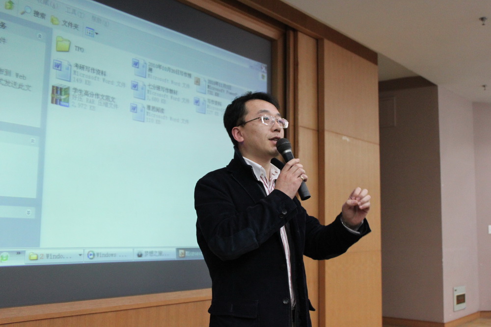 在从整体上领略了雅思考试的特点后,栾杰老师就写作一项进行了细致的讲解。写作考试与口语、阅读考试有着很多相似之处,但难度更胜一筹。栾杰老师先对是否遵循写作模板的问题发表了自己的看法,他不提倡用“随处可见”的模板,建议自己或几个人一起总结出一份个人专有模板,避免出现“撞车”现象。同时,他告诫同学们在写作中不要应用过于复杂的语法,“不求写好,但求写对”,另外要避免写作中出现中国式英语。在平时的学习中,栾杰老师提倡广泛阅读国外的报刊与书籍,多练口语,锻炼自己的英语思维,以便能够妥善应对国外宽进严出的教学制度。为提升同学们的英语水平,栾老师向大家推荐了老友记、绝望主妇、白宫风云等电视剧。谈到出国这个话题,栾老师认为应该理性对待,而不应该盲目跟风从众,避免出现得不偿失的情况。栾老师那风趣的话语,典型的案例,精彩的互动博得了现场同学阵阵掌声。