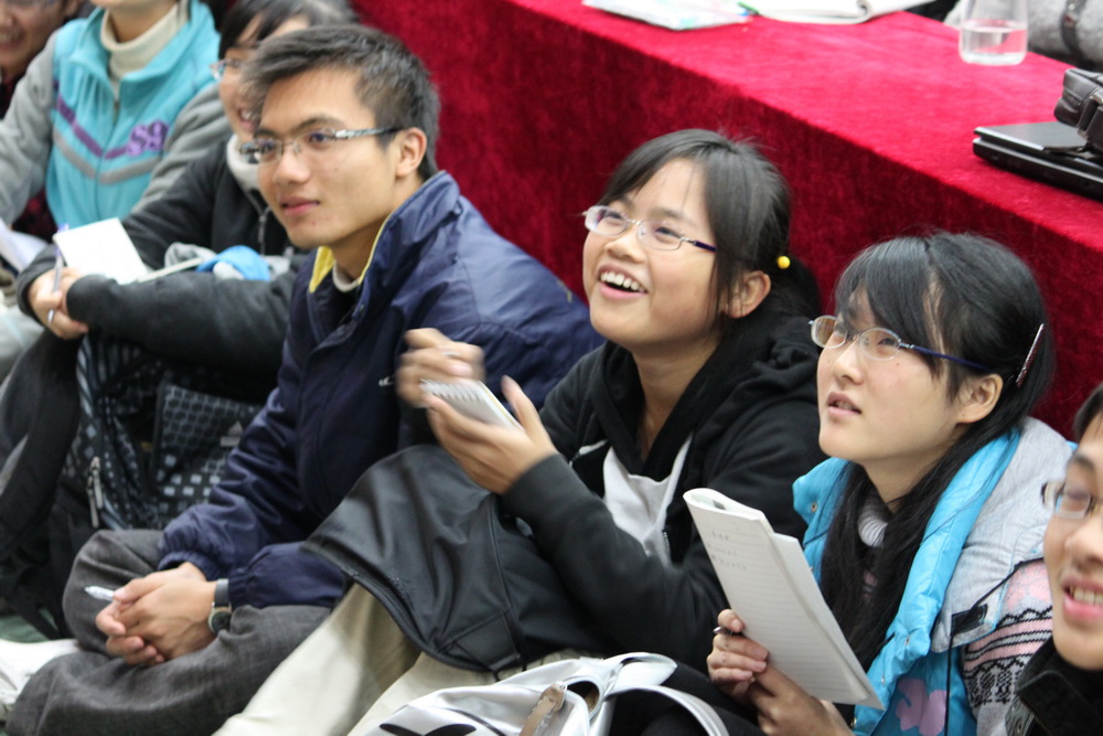 在主持人简短的介绍后,林翼飞老师首先上台。林老师从雅思、托福与四六级之间的差别入手,从题型、问答方式等方面诠释了雅思的独特之处。通过灵活的举例运用,巧妙的问答,林老师让同学们身临其境般地体会到雅思考试的特点,并精辟地总结了常见考题特征,令在场同学受益匪浅。随后,她让现场同学默写了几个生活中的常见词汇,挖掘着简单词汇拼写中蕴藏的大道理——细节决定成败。在强调细节的同时,林老师认为“在雅思考试中同学们不仅要有语言知识,还要了解这个国家的文化”。而究竟怎样才能取得一个理想的雅思成绩呢?林老师总结雅思考试需要“能力+技巧+机经(对题目的熟练程度)”这三方面技能,掌握了这三项技能后方能对考试应对自如。