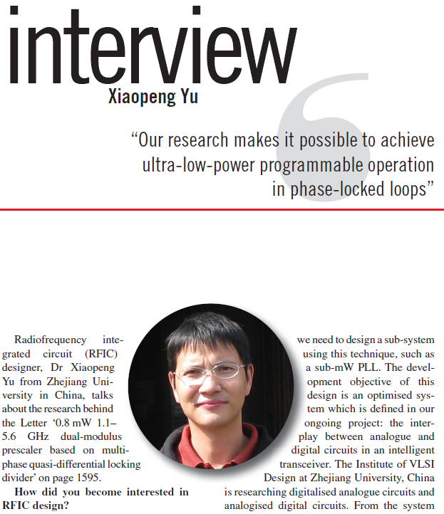 beat365平台唯一官网虞小鹏副教授于2010年11月25日发表在Electronics Letters(英国电子学快报)的论文“Dual-Modulus Prescaler Based On Multi-Phase Quasi-Differential Locking Divider”接受首页作者专访(类似于期刊的封面人物)。这是该期刊interview专栏成立以来第一次采访来自中国的研究者,也体现了国际同行对我校这一研究成果的高度认可。