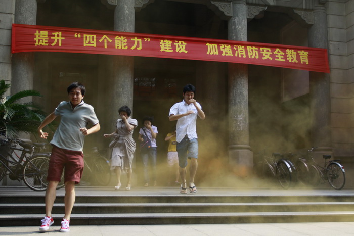 15:00消防演习正式开始,随着烟雾弹的燃放,滚滚浓烟迅疾从第二教学楼的一楼蔓延到四楼,急促的警报声在教二楼内响起,同时声光报警器迅速报警,向师生们传达撤离通知,各区域安全责任人立即引导本区域师生井然有序地按照教二疏散路线,师生们用毛巾捂住口、鼻,弯腰匍匐,迅速从安全出口撤离了现场,到达指定地点。接着是灭火演练,师生们上场实际操作灭火器,学习灭火器的灭火方法。通过本次模拟演习,检验了第二教学楼报警系统的有效性,增强了学院师生的疏散逃生能力和灭火器材的使用能力。