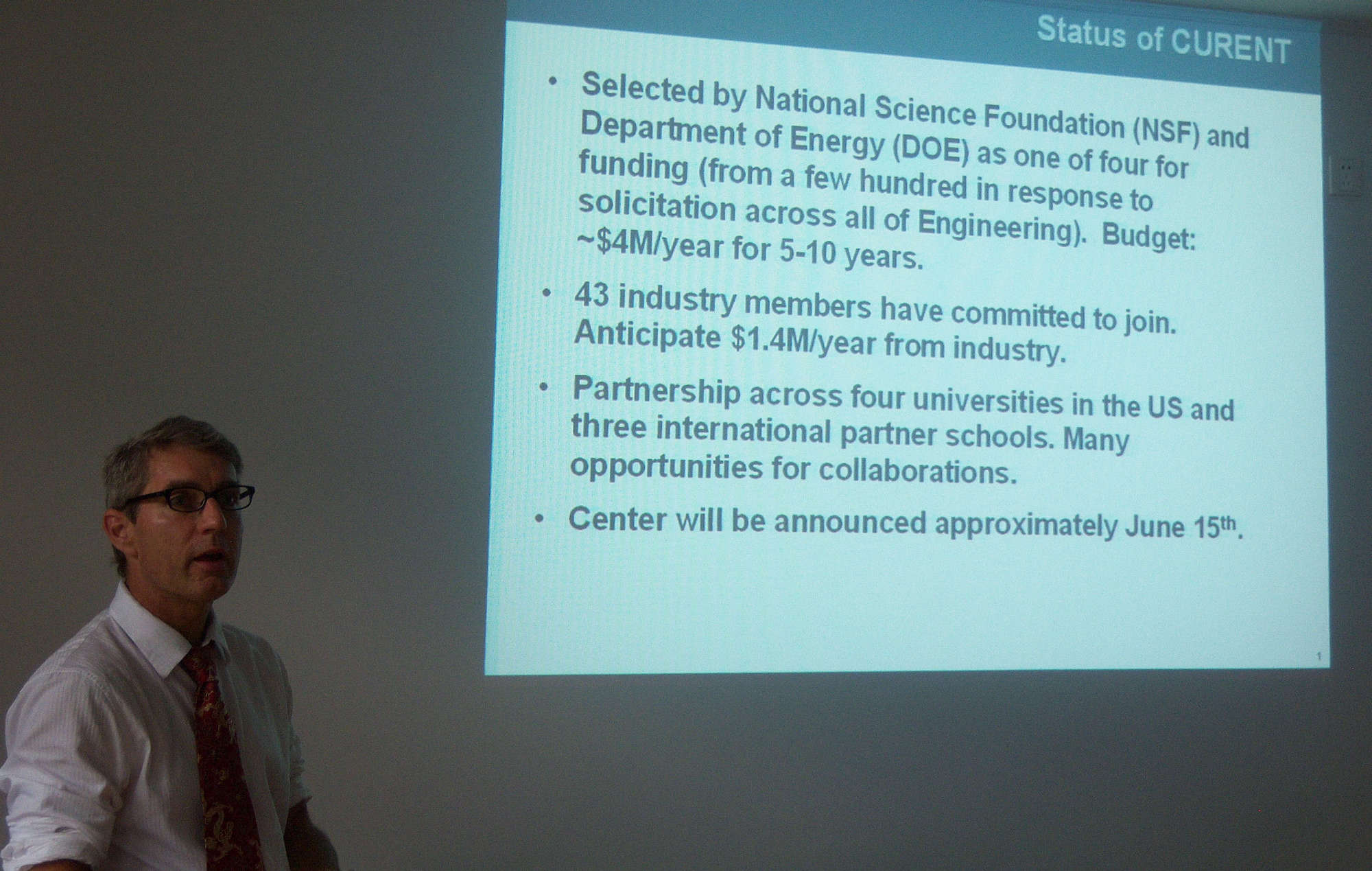 在学术报告中,Kevin Tomsovic教授详细介绍了CURENT工程研究中心的概况和研究内容。该研究中心每年将得到美国政府350万美金的经费资助,资助周期10年,其目标是通过全国或洲际范围内对输电网的全面监测和动态实时控制,以实现可再生能源的高效率、高可靠性、低成本和较好的兼容性。