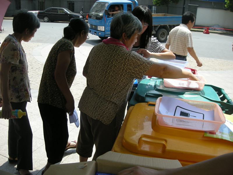 现场分别放置了绿色厨房垃圾桶、黄色其它垃圾桶、蓝色可回收垃圾桶和红色有害垃圾桶。为省去居民在模拟投放过程中掀盖、弯腰等麻烦,工作人员分别在各垃圾桶上放置了一个塑料筐,考虑到居民的卫生意识,细心的工作人员又用各种生动的垃圾图片加文字替代实物垃圾,避免了居民在投放过程中手拿垃圾的畏惧感。志愿者分工有序,分成了知识问答竞猜组、垃圾图片归类宣传组、评判监督组、奖品发放组和秩序维护组。在知识问答的过程中,志愿者一边提问,一边细心地向居民们讲解垃圾分类的理念;在图片归类的过程中,又耐心引导居民们投放到对应的垃圾桶位置,并在回收图片的同时,不忘向居民们耐心解释各种垃圾的所属类别。