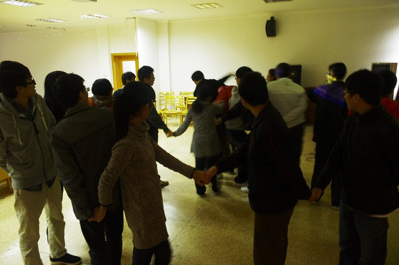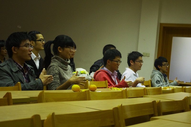 第一环节是答题,各小组需回答与本小组小说有关的问题。这个预热环节让大家见到了一些团干渊博的知识、广泛的兴趣爱好。中途有个小插曲,有一道题目,小说和电视剧里的答案不一样,告诫我们看书要看原版,做事看问题也要从最原始的信息着手。紧接着主持人播放了校歌和《生活大爆炸》两段视频,向大家提问,抢答并且答对的一组得分。主持人的问题几乎都让大家目瞪口呆,比如校歌中有几个于字、出现过哪几个建筑物、生活大爆炸中的靠垫是什么颜色等等,大家必须要有特殊的观察力、高度集中精神才能对题目有印象。这样一个费脑的抢答结束后主持人让大家都聚集到前方,告诉我们接下来的游戏是“情有千千劫”。所有人围成一个大圈子并且记住左右的人,然后随意走乱,立定后找到原来左右的人拉起手,恢复成原貌,这个活动让大家有了团结协作意识,并且需要一个首先的主导者教导大家如何解这一团乱麻。情有千千结的游戏调动起了大家的热情,接下来的竞答折报纸更是让气氛升到最高。主持人提问一些有关于团员、团建的问题,各小组抢答,答对则其他小组的报纸对折,而组里的两人需在报纸上站立10s,当报纸折叠四次后,男生几乎都只能或抱或背女生,这一活动完全让大家消除陌生感,当然也考机智。活动的最后,我们结合近期刚落幕的残奥会,给团委骨干同学进行了手语歌教学,希望大家感受残疾人的生活,提升社会责任感。