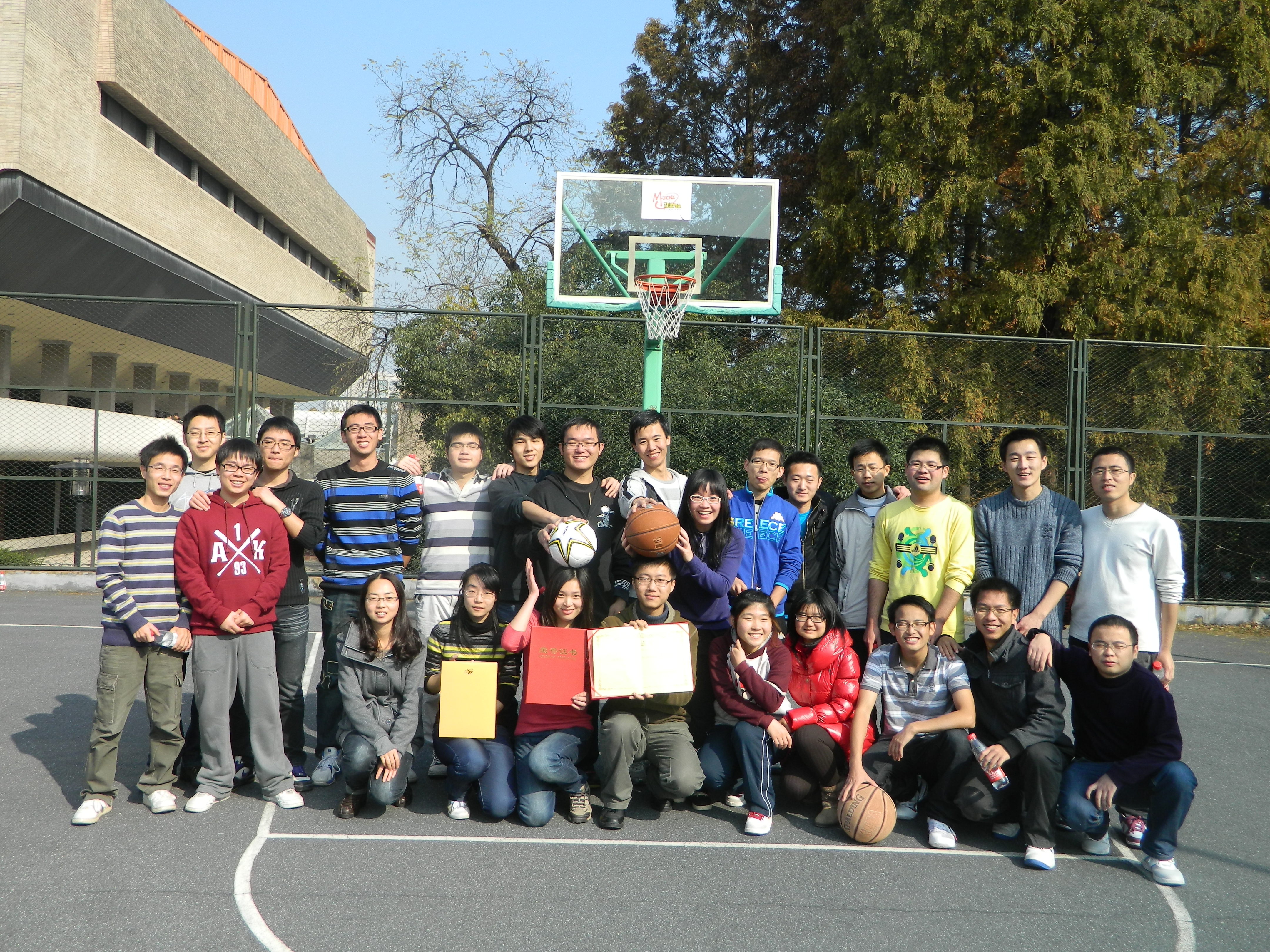 2011年12月3日,为培养班级及党支部凝聚力,积极响应健身活动月号召并努力将其发展成长期事业,鼓励研究生们走出实验室,积极锻炼个人身体素质,更为了增进班级同学之间的友谊并加深相互之间的了解,我班于邵体馆篮球场组织了一次别开生面的班级内部篮球友谊赛,班级绝大部分成员参与其中并着实享受到了初冬暖阳下打球的乐趣。