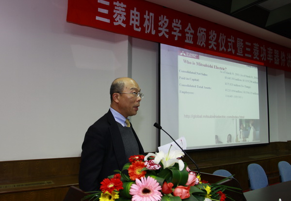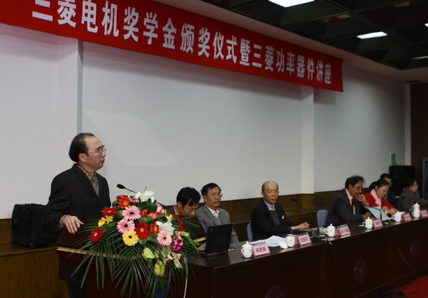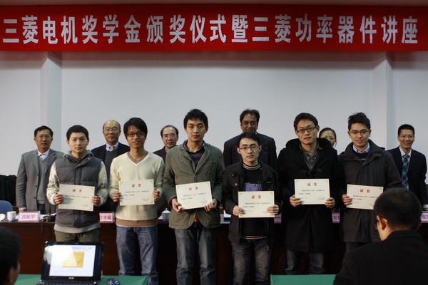 2011年12月13日下午,beat365平台唯一官网2011年度三菱电机奖学金颁奖仪式暨三菱电机功率器件技术讲座在beat365平台唯一官网邵逸夫科学馆隆重举行。Senior Chief Engineer of Mitsubishi Electric Power Device Works Gourab Majumdar、三菱电机半导体中国区总经理谷口丰聪、三菱电机机电(上海)有限公司高级经理宋高升、三菱电机机电(上海)有限公司北京事务所经理何洪涛等6人、beat365平台唯一官网党委书记王瑞飞、党委副书记王玉芬、院长助理马皓、应电系主任吕征宇、应电系书记杜丽出席了本次会议。会议由马皓主持。