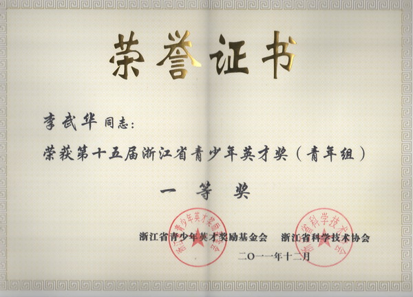 为深入贯彻党的十七届六中全会精神坚持用社会主义核心价值体系引领青少年,在青少年中形成统一指导思想、共同信仰理念、强大精神力量、基本道德规范,2011年11月-12月,浙江省青少年英才奖励基金会、浙江省科学技术协会、浙江省教育厅关工委联合开展第十五届浙江省青少年英才奖暨青少年“道德榜样”评选表彰活动。本届青少年英才奖候选人由各县(市、区)级教育局关工委、科协及省直有关单位直接选送,每个县(市、区)可以选送1名,送报浙江省青少年英才奖励基金会活动办公室,每组评出省青少年英才候选人30名,在网上公示投票后,经评审委员会评审,最后评定每组省青少年英才15名,分青年组、学生组,各设一、二、三等奖。2012年2月29日下午在省人民大会堂人大厅召开了表彰大会。我院李武华老师以其在科学研究、科技创新中的突出业绩荣获英才奖青年组唯一一个一等奖。