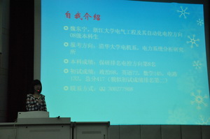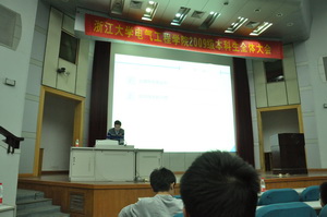 在各位老师的介绍讲解之后,大会还专门安排了参加2008级电气专业、自动化专业、电信专业“卓越计划”试点工作的学长向与会的各位09级同学进行了汇报。首先上台的是王一枫,他从浙江省电力设计院概况、实习内容、实习环境、毕业设计选题、实习收获等几个方面向大家汇报了2008级电气专业“卓越计划”长时间实习的基本情况。第二位上台汇报的仇俊伟则是结合自己对于实习单位杭州鸿雁电器有限公司的认识和介绍阐述了自己参与“卓越计划”的收获与感悟。随后电信专业的刘伟和赵力飞还分别向大家介绍了台达电子企业管理(上海)有限公司和杭州矽力杰半导体技术有限公司的具体实习情况。学长们详细的讲解令在场的每一位同学都收获颇丰,也更加形象具体的认识到“卓越计划”的实质内容和相关要求。