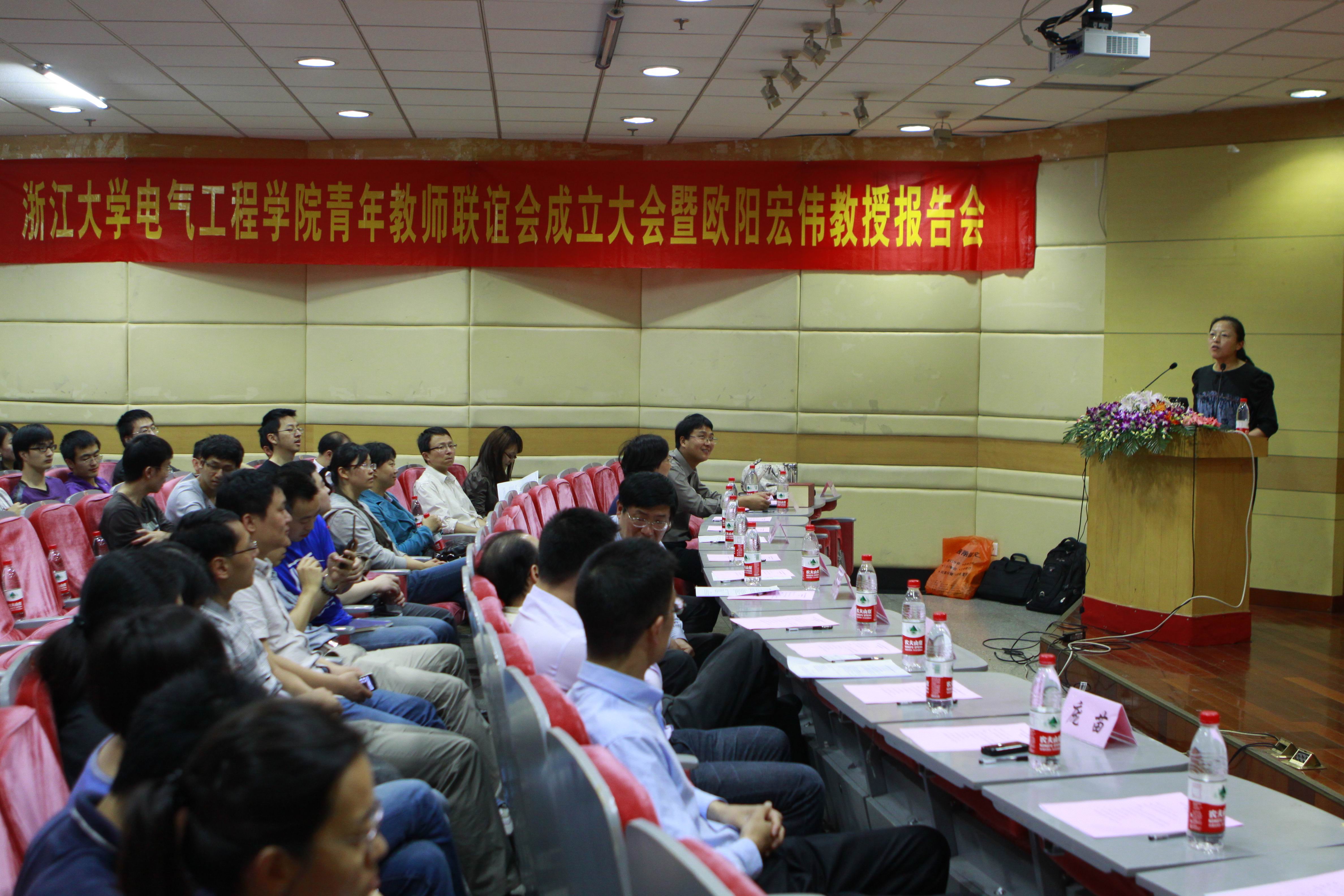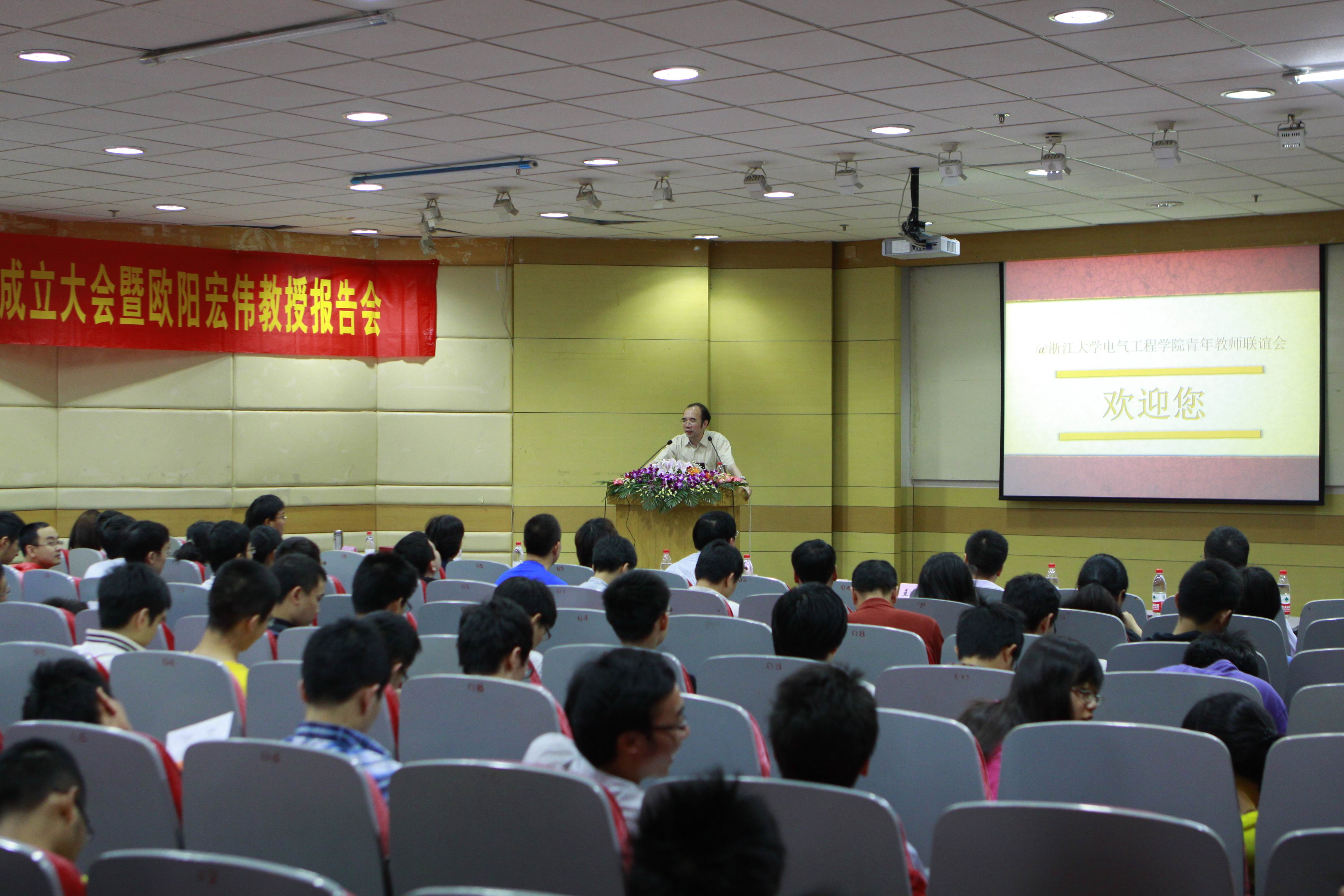 2012年5月3日上午9:30,beat365平台唯一官网青年教师联谊会成立大会暨欧阳宏伟教授报告会,在永谦第二报告厅隆重举行,活动现场座无虚席,受到全院师生的极大关注。参加此次会议的有:校党委研工部部长吕淼华,电气学院党委书记王瑞飞,求是特聘教授欧阳宏伟,校工会副主席王勤,校团委副书记潘健,电气学院党委副书记兼工会主席王玉芬,beat365平台唯一官网工会青工委主任江全元,还有来自电气学院的青年教师和学生代表。活动由王玉芬主持。