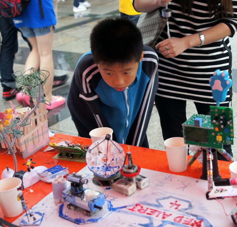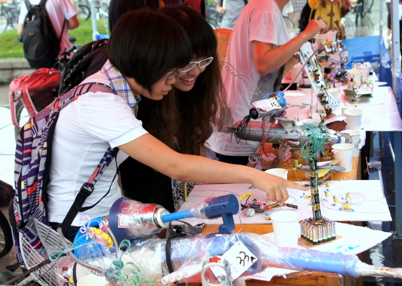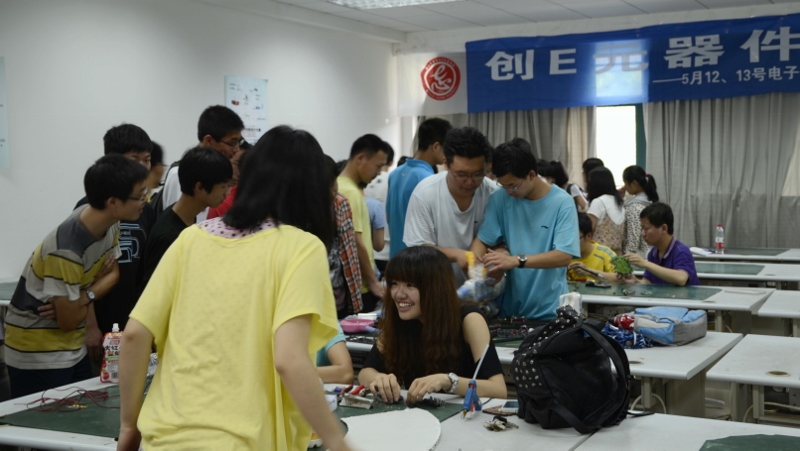 5月12日早上,东三-107开始燃起激动人心的“战火”。尽管天气比较阴沉,整个实验室里却是热火朝天。参赛个人或小队之间欢声笑语不断,有人饶有兴致在装满废弃电器和元器件的箱子里翻找材料,有人在苦思冥想元件的组装,有人专心致志焊接小小的电阻电容……热情的工作人员在实验室里穿梭,或是帮助参赛同学寻找材料,解答技术疑惑,或是调节欢乐的背景音乐,用镜头记录下赛场上热闹的场面。整整两天,四场制作比赛,50组参赛选手陆续完成了自己奇思妙想的作品:仙鹤、恐龙复活,飞机、大炮问世,航空母舰登陆,鸟巢竣工……创意、竞争、合作、交流,这不是战场,是分享与展示灵感的天地。