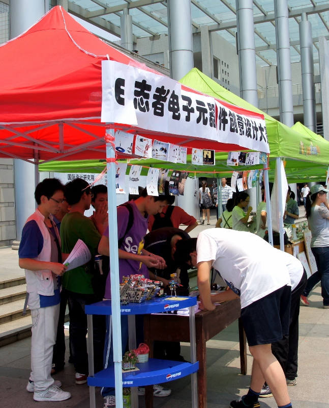 从5月2日开始,E志者通过cc98论坛、人人网、蜡笔校讯等网络信息平台进行活动前的宣传工作;5月5 -6日,在紫金港各学园和文化广场进行现场宣传,精美的样品伴着欢快的音乐,吸引了同学们前来咨询并报名参赛;与此同时,寝室楼下张贴出了精美的海报,校园里挂出了醒目的横幅。出色的宣传工作,为后续的比赛奠定良好的基础。