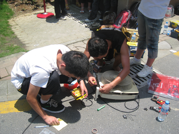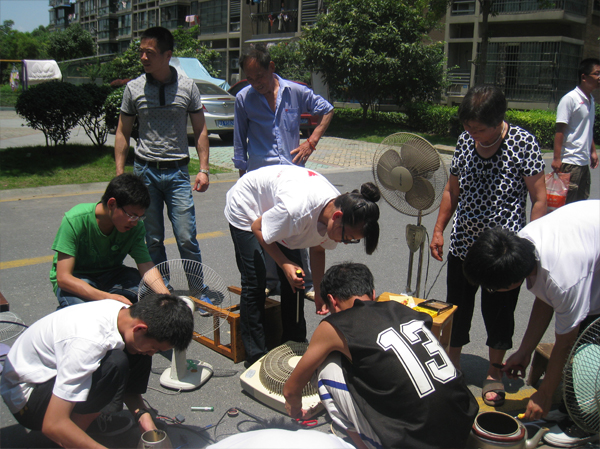 修理之中也碰到不少困难,没有合适的配件,找不到问题等,但是E志者们都是尽了自己最大的努力,烈日炎炎之下,很多同学都忘记了背上所背负的太阳是何等地凶残,豆大的汗珠不住地往下滴,甚至干扰了视线,但是一仰头,一抹汗还是接着干,丝毫没有要退却的样子。送修的居民们也很心疼,主动为我们打伞,劝我们转移维修地点到阴凉处,但电源地点是固定的,所以我们也只能强忍下去。