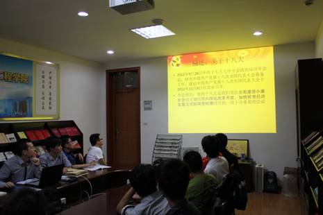 首先,由支部书记沈绍斐向与会成员简要介绍了支部本学期主题活动的几大设想与安排。随后,通过事前精心准备的PPT为大家普及了关于十八大的一些知识,其中主要分析了十八大召开的国内外形势,以及展望了十八大在我国改革开放发展大业中的重要性。当讨论到国际形势时,近期频繁的周边国家领海岛屿纠纷问题,特别是中日钓鱼岛纷争时,引起了同学们较大的兴趣,大家就此提出了各自的看法,都表示相信我党会充分发挥智慧,在国际政治斡旋中占据优势,为祖国的进一步发展打造好的环境!