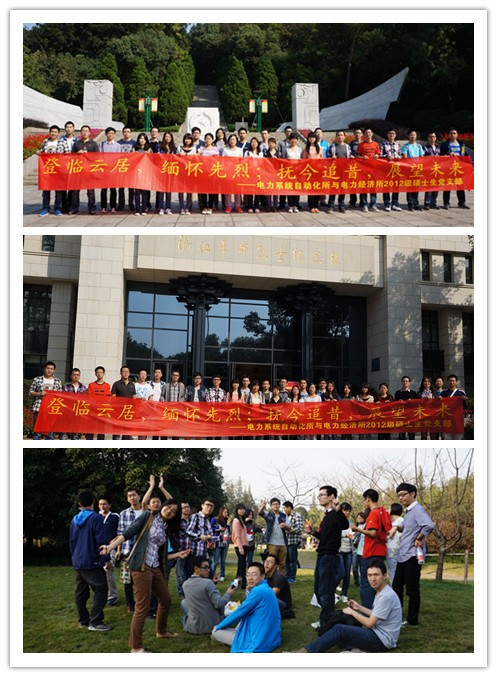 金风送爽,阳光普照。2012年10月18日,在党的十八大即将召开之际,电力系统自动化所与电力经济所2012级硕士生党支部的成员们伴随着温暖的阳光,前往万松岭革命烈士纪念馆进行参观,瞻仰革命烈士纪念碑,之后前往杭州太子湾进行联谊活动,开展了“登临云居,缅怀先烈;抚今追昔,展望未来——电力系统自动化与电力经济2012级硕士生党支部活动。