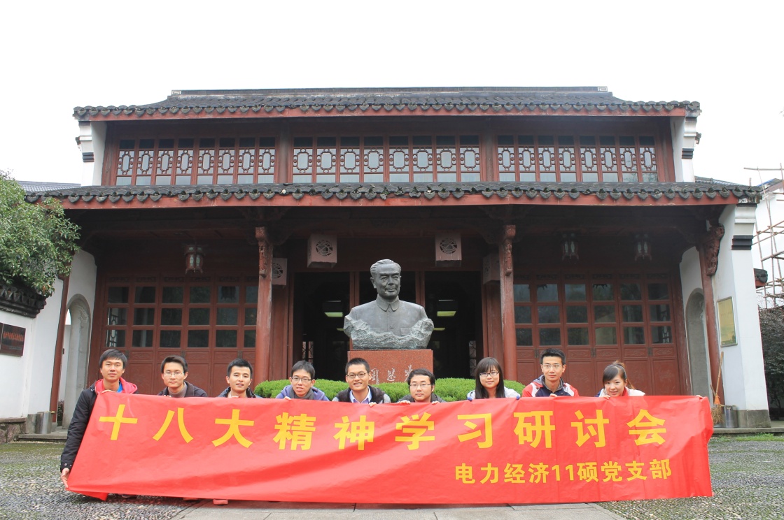 2012年11月24日,为庆祝中国共产党第十八次全国代表大会的顺利召开,电力经济11硕党支部组织了杭州梅家坞考察学习活动。党员们踏上红色之旅,前往位于杭州西湖区梅家坞村的周总理纪念馆考察学习,循迹周总理五次亲临梅家坞关心农村发展这种全心全意为人民服务的精神,并举行了学习十八大精神研讨会,为我支部更好地贯彻落实十八大精神奠定基础。
