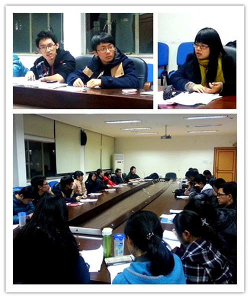 讨论开始前,潘伟老师作了简短的讲话。在讲话中,潘老师提到了工科院系学子的普遍特点,就是能干实事,不太能说。但话锋一转,紧承十八大会议后习总书记的号召“空谈误国,实干兴邦”,潘老师对在座的各位进行了鼓励,并倡导大家在接下来的讨论中避免说套话、说空话,多多交流内心的真正认识。