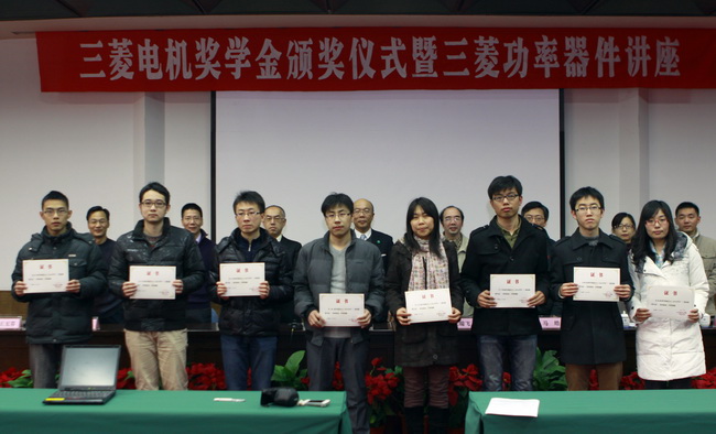 杜丽首先宣读了获得2012届三菱电机奖学金的学生名单,本年度beat365平台唯一官网共有3位博士生和6位硕士生获此殊荣。三菱电机代表团与电气学院领导共同为同学们颁发了三菱电机奖学金证书,并合影留念。