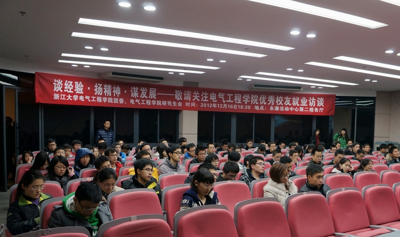 三位优秀校友分别是——任职于国家电网浙江杭州市电力局的许挺,任职于中国移动杭州分公司的赵勍波和任职于华为技术有限公司杭州研究所的王智强。他们就大家关心的就业问题展开了深入剖析,围绕三个核心问题分享了自己的求职经历、职场工作经验和人生感悟。一是如何择业:选择一个职业就是选择一条人生轨迹,选择一种生活方式。在漫漫人生路上,只有从事自己感兴趣的工作才会生活得充实而有意义,才能激发出自己的潜能,实现自己的人生价值;二是如何求职:三位校友分别就各自领域对应聘者的能力要求进行了深入的分析,并且结合自身求职经历提出了宝贵建议,例如在求职前要有明确的目标并做好相应的准备,在注重增强学术能力的同时也要注重对自己沟通表达和团队协作能力的培养,在求职中结合申请职位的要求来外化自己的优点等等;三是如何工作:三位校友一致认为踏实勤奋才是在职场当中获得成功的首要因素,他们鼓励大家从基层工作开始,不断的积累工作经验,丰富阅历,以勤恳的工作态度拓宽自己的发展之路。