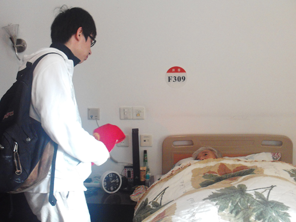 之后,同学们又与一位老奶奶谈了心。她是一位解放军,当初建功立业,为建设我国贡献了自己的力量,同学们不由地心生敬佩。老奶奶现在得了治不好的腰的毛病,只能躺在床上,大家心里很不是滋味。时光流逝,傍晚时分,大家依依不舍的离开了老年公寓。