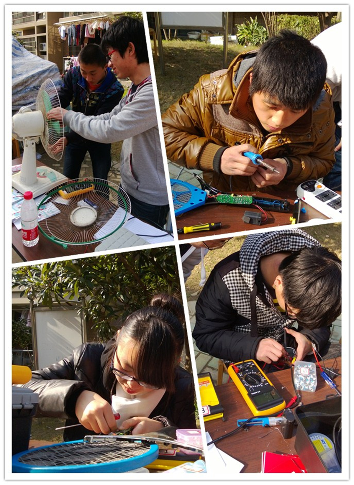 九时整,E志者们和虾龙圩社区的志愿者一起准时开始现场免费电器维修活动。社区志愿者们为居民们登记好送来的电器,E志者们则有条不紊地一件又一件拆卸、检查、维修坏掉的电器。活动开始后短短半小时,在挂着活动横幅的长桌上,就围拢了不少带着问题电器前来询问的社区居民。前来送修的电器中主要有台灯、电吹风、电扇、电蚊拍、电热水壶等,总计收到问题电器五十七件,成功维修三十五件,每件电器都做了详细的登记。