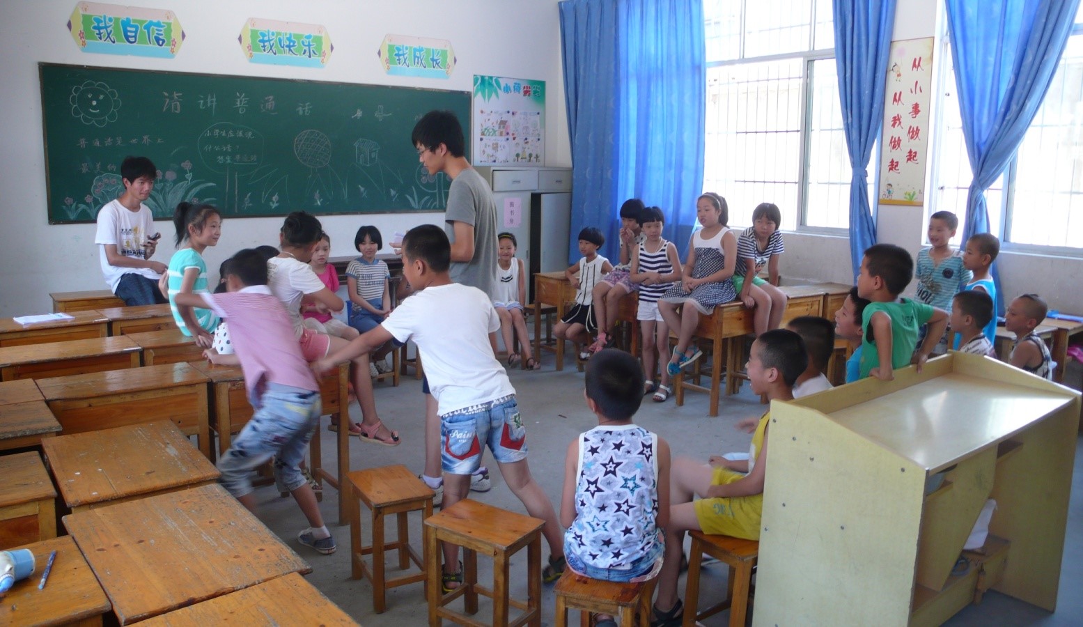 8月5日,是春泥课堂一年一度的趣味比赛,由于天气炎热以及体育设备暂时无法借到等原因,大部分的游戏放在室内进行。其中有考验大家观察能力和思维能力的数独游戏,表演能力与团队配合默契程度的猜词游戏,记忆力和反应速度的“萝卜蹲”,动静结合,在鼓励同学们多思考多锻炼的同时,也让他们在游戏中尽情地娱乐,增进互相之间的感情。两个小时的时间在欢乐和笑声中度过了,我们的春泥课堂也只剩下不到一个星期的时间,希望今天的笑声能成为大家永远的记忆,愉快、充实、顺利地完成接下来的教学工作。
