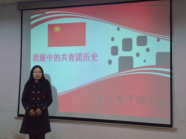 中国共产主义青年团,是中国共产党缔造并领导的一个具有光荣历史和革命传统的先进青年的群众组织,70多年来,中国共青团走过了光辉的历程。2013年11月20日,在感恩节即将到来之际,为了感谢革命前辈,进一步增强我支部团员们的感恩意识,同时也是为了配合学院“团建统筹工程”工作的开展,电工电子团支部举行了宣讲团史的团日活动。