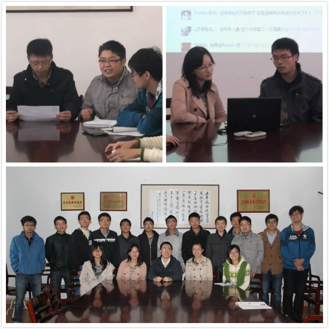 首先党支部书记、主持人周贺简要介绍了此次活动的背景,指出党的群众路线一直是一个历久弥新的话题,在十八大召开后,党中央对于群众路线的总要求有了更加形象生活的诠释——“照镜子、正衣冠、洗洗澡、治治病”。同时他也强调了自己对党支部建设所坚持的一贯宗旨,即广泛化、个性化,希望将电力电子13硕党支部打造成一个凝聚力和活力并存的集体。