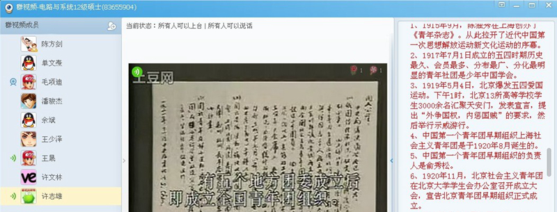 我们团支部在QQ群视频里为大家播放了视频“中国共青团发展的历史”,从1919年的五四运动开始,到中华人民共和国成立以后,视频讲述了这一段时期共青团的历史状况,从共青团的成立到国家的建立,团史就是一部抗战史,就是一部中国人民一步步走过来的辉煌路,看过视频后,另自己也学到了很多新的知识。视频给了大家很形象的直观感受,而文字的讲解,则给了大家更好的理解和记忆,让这一次宣讲更加深入,更加富有意义。