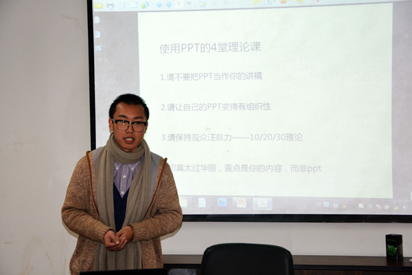 121日下午,学工部现代写作中心的董征远学长应邀前来紫金港校区小剧场B215,给参加培训的“步步‘精’心,脱颖而出”风采展示训练营SQTP项目组学员关于PPT制作上了生动的一课。