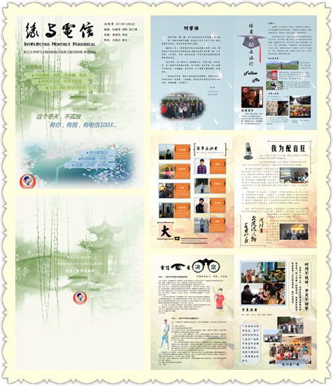 创刊号的主题由团支部委员、党支部委员以及班委共7人组成的“班刊小组”商议和酝酿形成。结合时事焦点,本期班刊包括一个“电信眼看‘决定’”的板块,让同学们畅谈自己对党的十八届三中全会的认识和具体的看法。为了展现丰富的班级党支部和团支部组织生活,本期班刊专门开设了“我为配音狂”板块,记录了电信1003班举办的几年毛泽东诞辰120周年的视频配音和影视观赏主题活动。“眼睛和心灵,总有一个要在路上”,旅行也是大学生活必不可少的一部分,保送本校博士生之后的李战同学自告奋勇,希望把自己最近在杭城行走的收录的美景和感悟分享给同学们,“跟着战博去旅行”由此诞生。在每个人心中,大学时光都是难忘的,“流金岁月”板块将通过照片墙将电信1003班共同走过的登山、毅行、过生日、尝美食、聊时政、开班会等难忘时光定格下来。经过班刊小组的讨论,最后一个板块留给同学们用一两句简短的话描绘关于大学最后一年、关于未来的梦想和展望,让更多的同学参与到这个活动中来。