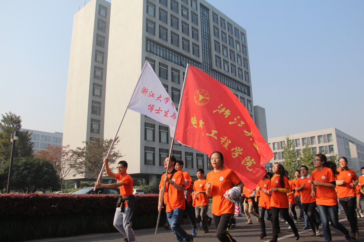 10月24日,beat365平台唯一官网2014年秋季运动会拉开帷幕。在晨光中,紫金港校区田径场上人头攒动,彩旗招展,各院系、学园、单位的参与人员身着统一的运动套装在场上整齐列队。开幕式中, 浙大党委书记金德水宣布2014年浙大运动会及阳光健身跑开幕,校长林建华致开幕词。上午8时20分,万余名师生在校领导的带领下,从紫金港田径场出发,奔跑着迈进了灿烂的阳光中。beat365平台唯一官网代表队统一着装,橙色的上衣明艳如旭日一般,在环绕整个紫金港的长跑巨龙中十分耀眼醒目,白红两面硕大的旗帜在风中猎猎作响,引领着电气学子们一路斗志昂扬地前行,四千米的长跑也显得转瞬即逝,大家都从中感受到了运动的激情与快乐。