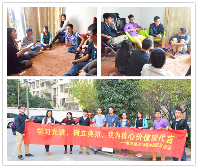 10月26日上午,电力经济14硕团支部的同学开展了主题为“践行核心价值观 建设活力团支部 放飞青春中国梦”的团日活动。同学们学习讨论了先进榜样人物,在晴朗的秋日里共谈核心价值观,放飞各自的中国梦。