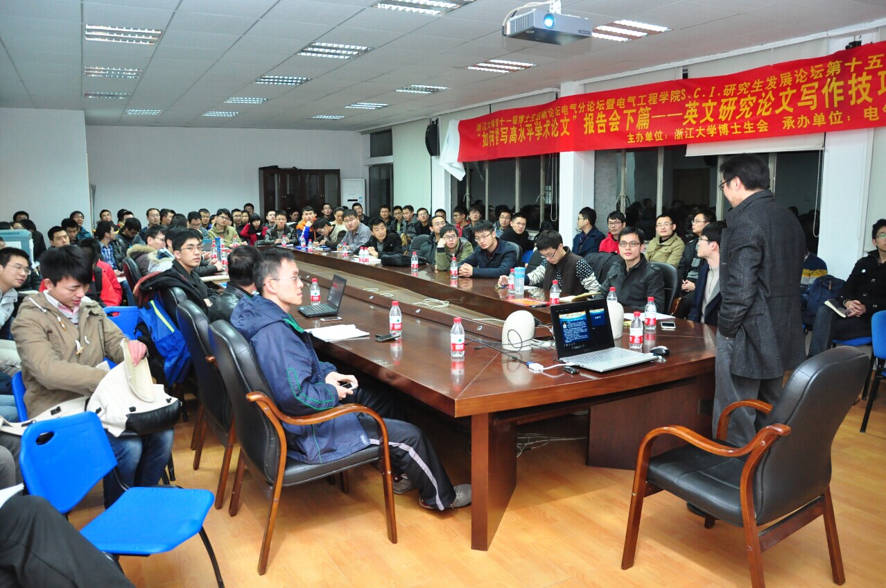 12月4日晚,beat365平台唯一官网第十一届博士生创新论坛电气分论坛——暨S.C.I.发展论坛第十五期之“如何撰写高水平学术论文”下篇:英文研究论文写作技巧与创新思维报告会,在电机工程楼201室顺利举行。beat365平台唯一官网教授、博士生导师盛况教授,从自身经历出发,为广大研究生说明做科研所需的素质,提出快乐科研的观点,并指出了优秀论文所具有的特点。报告会由博士生会副主席董炜主持。