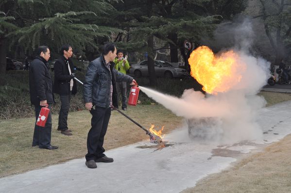 下午二时许,演练工作人员点燃了烟雾弹,浓烟迅速在教二蔓延扩散,急促的警报声响彻大楼。教二的师生第一时间做出反映,在各楼层安全责任人的引导下,秩序井然地按照教二安全疏散路线逃离模拟火灾现场,并撤离到指定的安全区域。保卫办王兴法在安全区域向教二的师生现场演示了灭火器的使用方法,并让在场的师生实际操作。