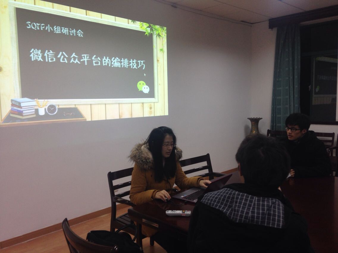 为了进一步提高微信公众平台的编排质量,优化平台的用户界面,1月8日晚9:00,电气学院“大学生新媒体团队建设与技能素质提升”SQTP小组在教二405开展了关于微信公众平台内容编排技巧的组内研讨会。小组成员一一讲述了自己在内容编排上遇到的问题和积累的相关经验。通过网络资料的搜集以及组内成员的探讨交流,大家不仅拓宽了思路,也学习到了很多关于微信公众平台内容编排的相关技巧。
