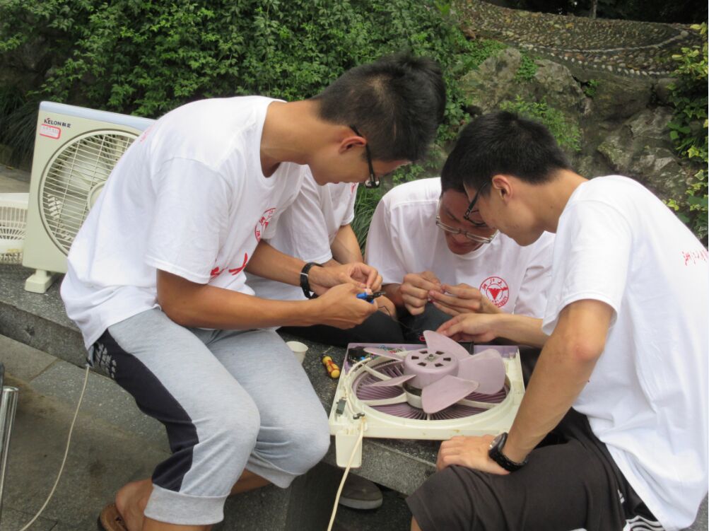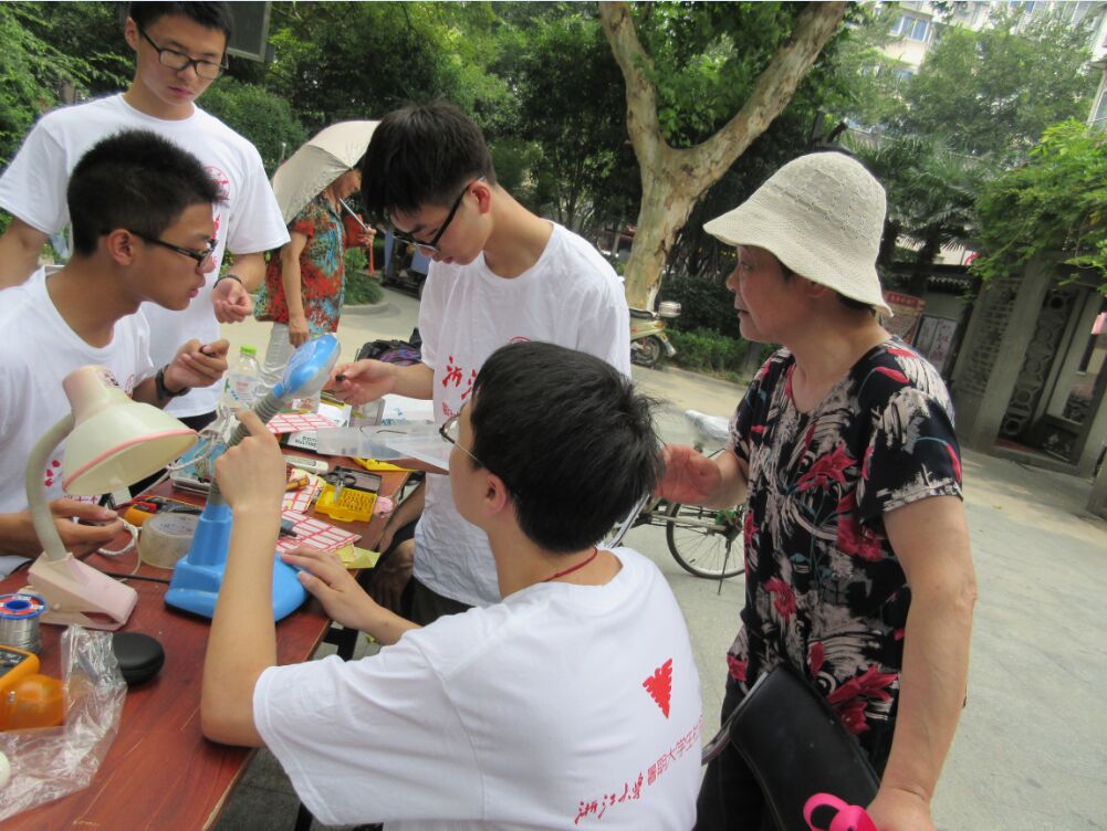 截至午饭前,队员们已经收到了20余件电器,有老奶奶送来的不会转动的电风扇,有老大爷送来的指示灯坏了的热水壶,还有抱着小孩的中年妇女送来的按键失灵的游戏机,更有众多的收音机、电饭煲、台灯……当然由于实践经验的不足和其他一些问题,还有好几件待维修电器队员们仍无法解决,但他们都尽己所能,用一腔热忱,为社区居民们服务。