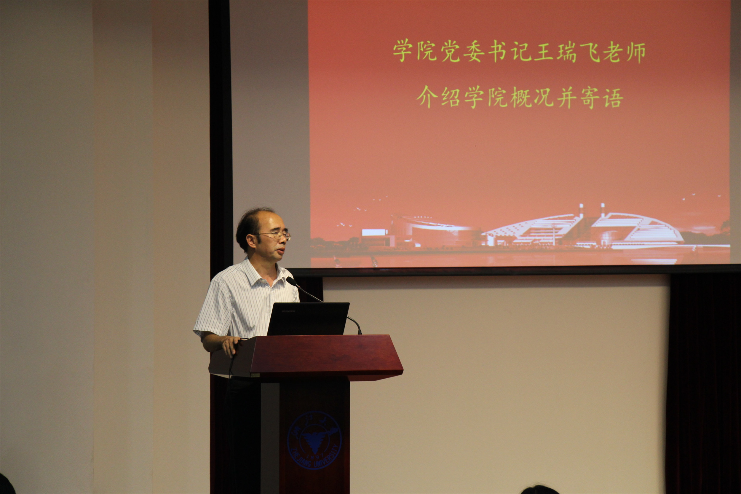 庄严雄壮的国歌后,学院党委书记王瑞飞老师亲切致辞。王老师首先代表学院对2015级研究生新生表示了热烈欢迎,同时特别传达了习总书记在今年教师节前夕给浙大教师的回信精神,表达了总书记对浙大发展的关心及对浙大师生的高度重视,希望同学们认真学习报效祖国,不辜负总书记殷切期望。接下来,王老师从建校历史、研究成果、师资力量、学科专业、培养体系、师生关系等方面出发,结合自身体会总结出了电气学院“厚重、齐全、完整、和谐”的八字特色,铿锵有力,发人深省。最后,王老师也对广大研究生提出了四点期望,一要认真反思,科学规划,精彩人生;二要端正心态,脚踏实地,志存高远;三要融合平衡,全面发展,追求卓越;四要强身健体,劳逸结合,健康成长。王老师的谆谆教悔着实让在场的同学们受益匪浅。