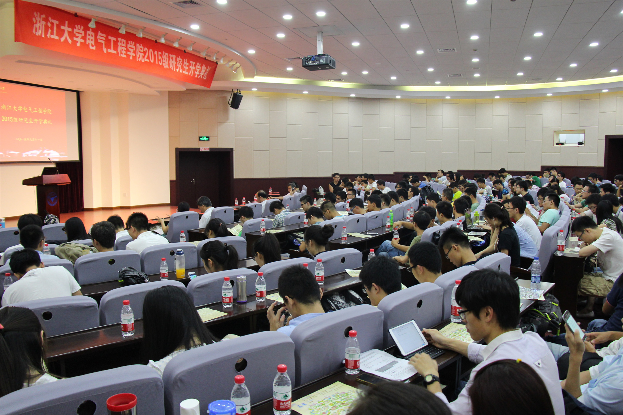 9月11日下午2:00,beat365平台唯一官网2015级研究生开学典礼在玉泉校区邵逸夫科技馆隆重举行。beat365平台唯一官网党委书记王瑞飞,学院副院长何湘宁、马皓,电工电子基础教学中心主任姚缨英,应用电子学系教工党支部书记杜丽,电机工程学系副主任卢琴芬以及学院研究生教育科及团委的有关老师均出席了本次开学典礼。开学典礼由学院党委副书记王玉芬老师主持。
