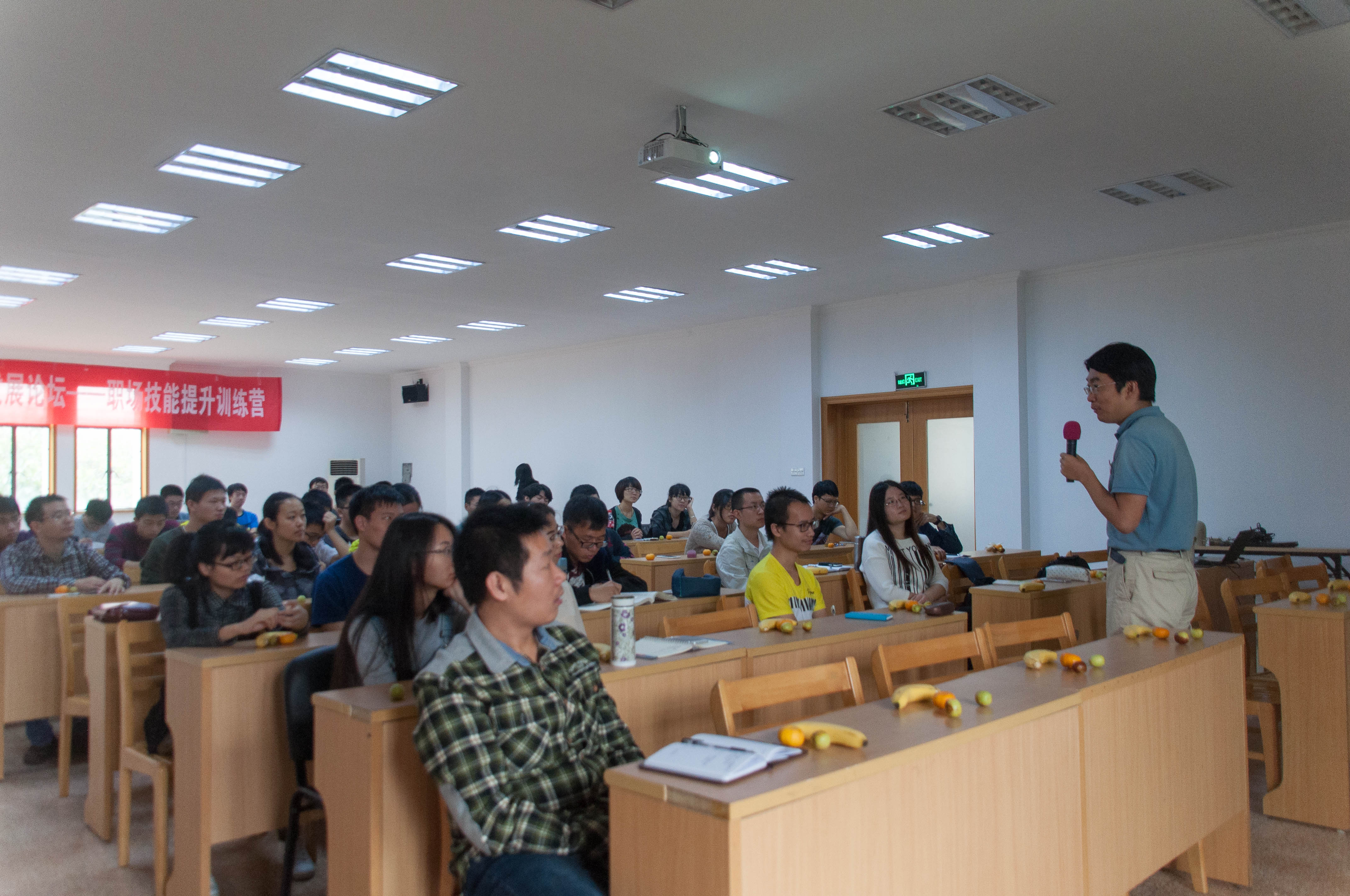 在讲座一开始,梁旻博士先为大家放了一段视频,提出名校生入职容易却难晋升的问题,提醒大家在成功时也要改变自己,不断进步。然后梁旻博士跟大家讲述了目前企业和求职者的双向选择困难现象,建议大家平时除了学习好专业课程外还要注意锻炼自身的各项能力。