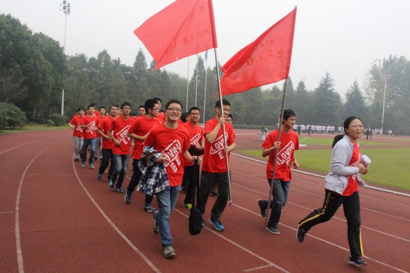 阳光长跑拉开了本届运动会的序幕,电气学院的红色旗帜异常醒目,飘扬在浩浩荡荡的充满朝气的队伍中。同学们在学院党委副书记王玉芬老师的带领下从田径场出发,围绕紫金港跑一周,那一列整齐有序的红色身影是清晨的阳光下和紫金港浓浓绿色中一道靓丽的风景。