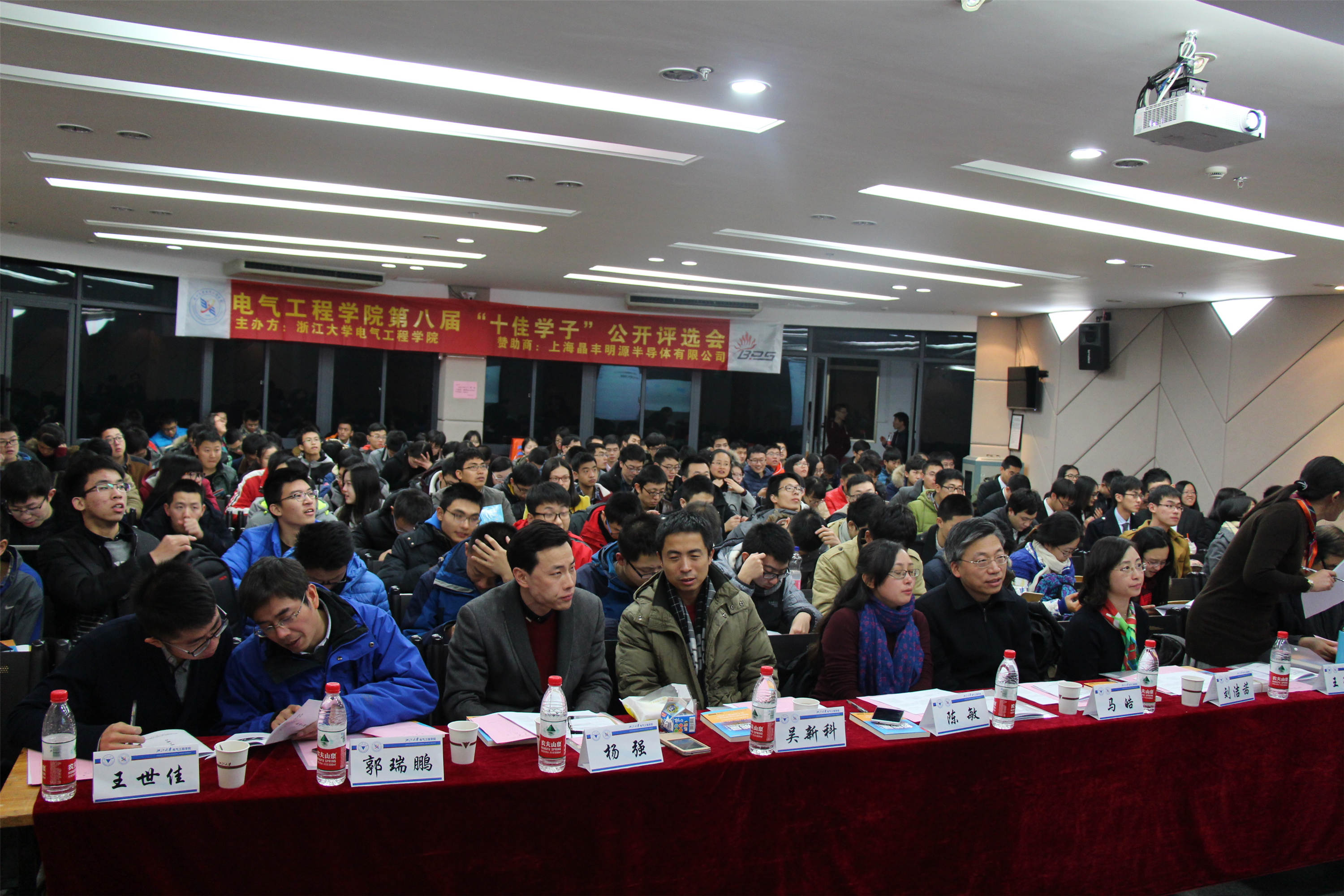 12月18日晚,beat365平台唯一官网第八届“十佳学子”答辩会在永谦剧场第二报告厅顺利举行。上海晶丰明源半导体有限公司联合创始人刘洁茜,beat365平台唯一官网副院长马皓,党委副书记王玉芬,团委书记陈敏,浙江省教学名师潘再平,心平杰出教学贡献奖获得者姚缨英,国家优秀青年科学基金获得者吴新科,优秀班主任杨强,电气1404班班主任郭瑞鹏出席了本次公开答辩会。此次答辩会还邀请到了博士生会主席王世佳同学、研究生会副主席刘思同学,学生会主席王琳同学以及150余位学生评委。