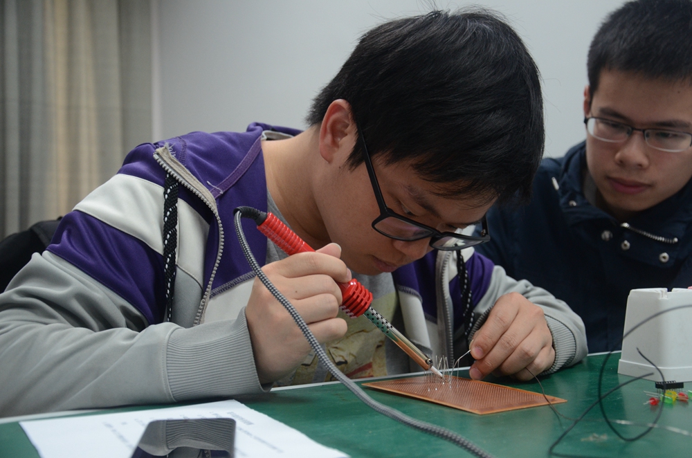 为了让不同学科背景的同学充分了解焊接技术,4月8日下午,由电气学院E志者协会吴俊杰同学向大家详细介绍了电路板焊接的要点和技巧。很快,同学们对电路板焊接的热情被调动起来,随后展开的就是兴趣组的焊接比赛。虽然很多同学是第一次接触,难免有些害怕而过于小心,但很快好奇心和拼劲战胜了恐惧。兴趣组比赛题目是一个LED三灯循环闪烁电路,虽然原理简单,但伴随着闪烁的灯光,这些非工科的同学们也都收获了一次别样的焊接体验。