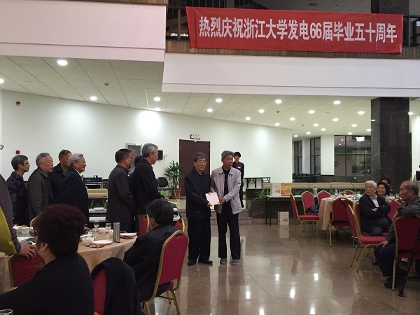 中科院院士、原浙大校长韩祯祥先生等曾任教过发电61级的几位老教师不顾年迈,赶来与校友们相聚。原电机系系主任李菊教授作为教师代表讲话。她回顾了50年前和校友们一起度过的难忘时光,尤其是在新安江电厂实习时和学生们一起的生活岁月,祝愿校友们身体健康。