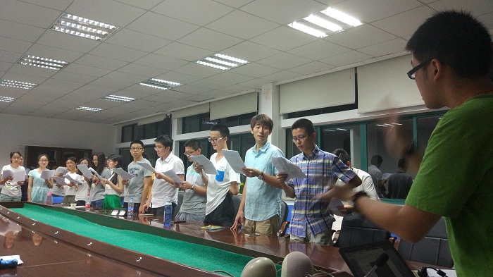 首先还是先对校歌进行排练。因为我们系统方向有大概一半原来本科是外校的,难免对浙大校歌比较生疏。经过前两次排练以及平时多听听校歌,这次排练大部分同学都已经对校歌相当熟悉,能在不看歌词的情况下比较顺畅地进行合唱了,但是音准还有待提高。因此此次的排练,指挥同学对我们唱歌有些细节方面的东西进行了修正,重点抓唱不准的地方进行纠正练习。