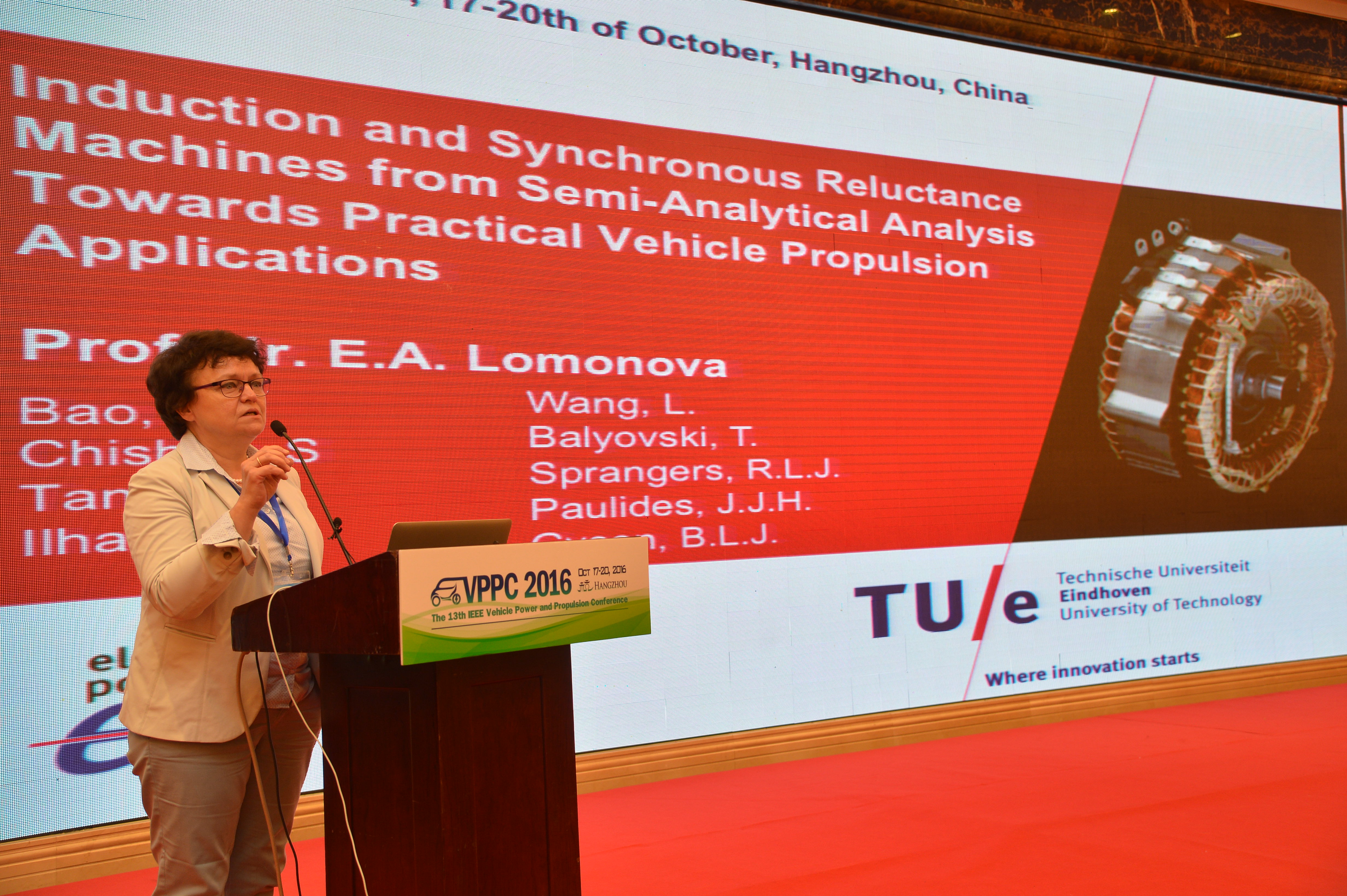 随后E.A.Lomonova教授作题为Induction and Synchronous Reluctance Machines from Semi-Analytical Analysis towards Practical Vehicle Propulsion Applications的主题报告。从最基础简单的定转子结构讲起,分析电机的等效磁路(Magnetic equivalent circuits)、混合模型(Hybrid modeling),并通过设计、控制、容错等方面举例分析磁通切换电机(FSM)。报告中,大量的计算推导、仿真分析,让与会者深有感触。